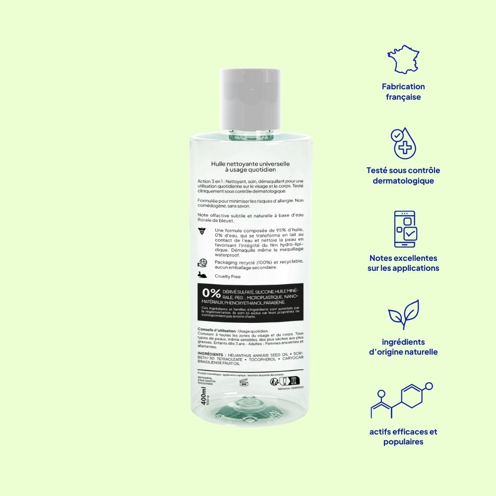 LipiClean est une huile nettoyante universelle qui peut être utilisée par toute la famille au quotidien, sur le corps et le visage (ne pique pas les yeux) en complément ou en alternance des nettoyants habituels pour protéger la barrière cutanée, redonner du confort, de l'hydratation et de la souplesse aux peaux les plus sèches et les plus sensibles. Sa texture ultra douce composée à +95% d'huile naturelle (et 0% d'eau), se transforme en lait au contact de l'eau et nettoie la peau (même maquillage), tout en préservant le film hydro-lipidique et le microbiote cutané. Formulée sans sulfate, sans savon et sans parfum pour limiter les risques d'allergie, elle a été testée cliniquement sous contrôle dermatologique sur peaux sensibles